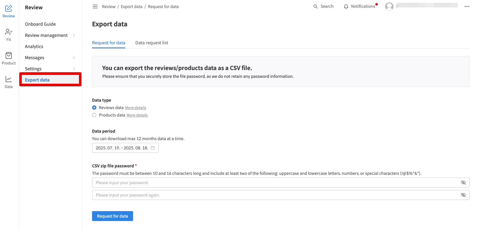 ⌘ You can download max 12 months data at a time. - Set a password for CSV zip file containing the exported data.