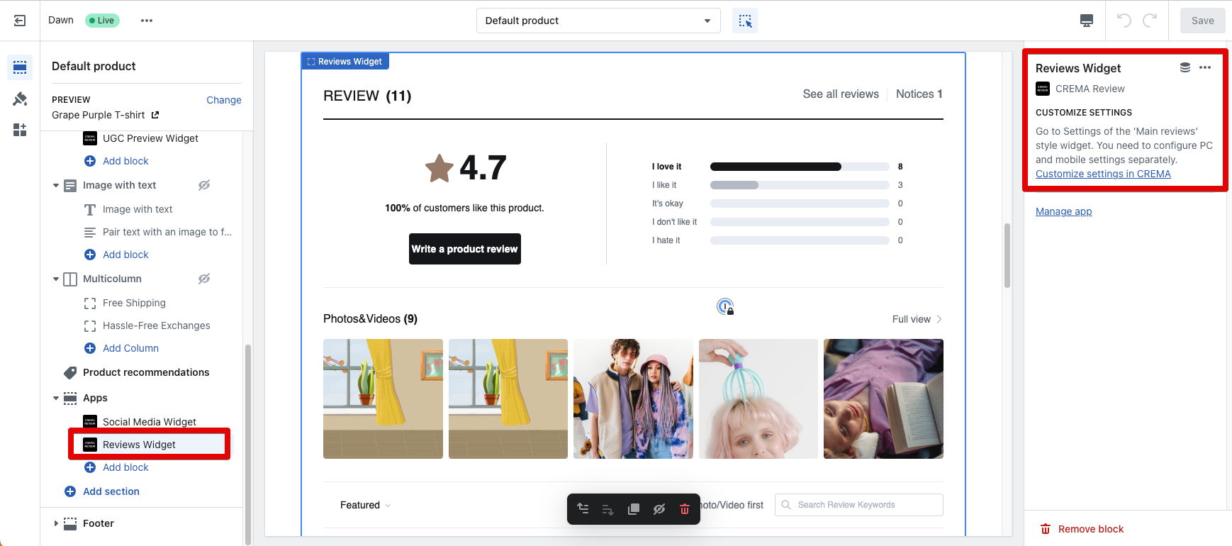 You can go to the widget's setting menu in CREMA admin page simply by clicking Customize settings in CREMA on the app-block.