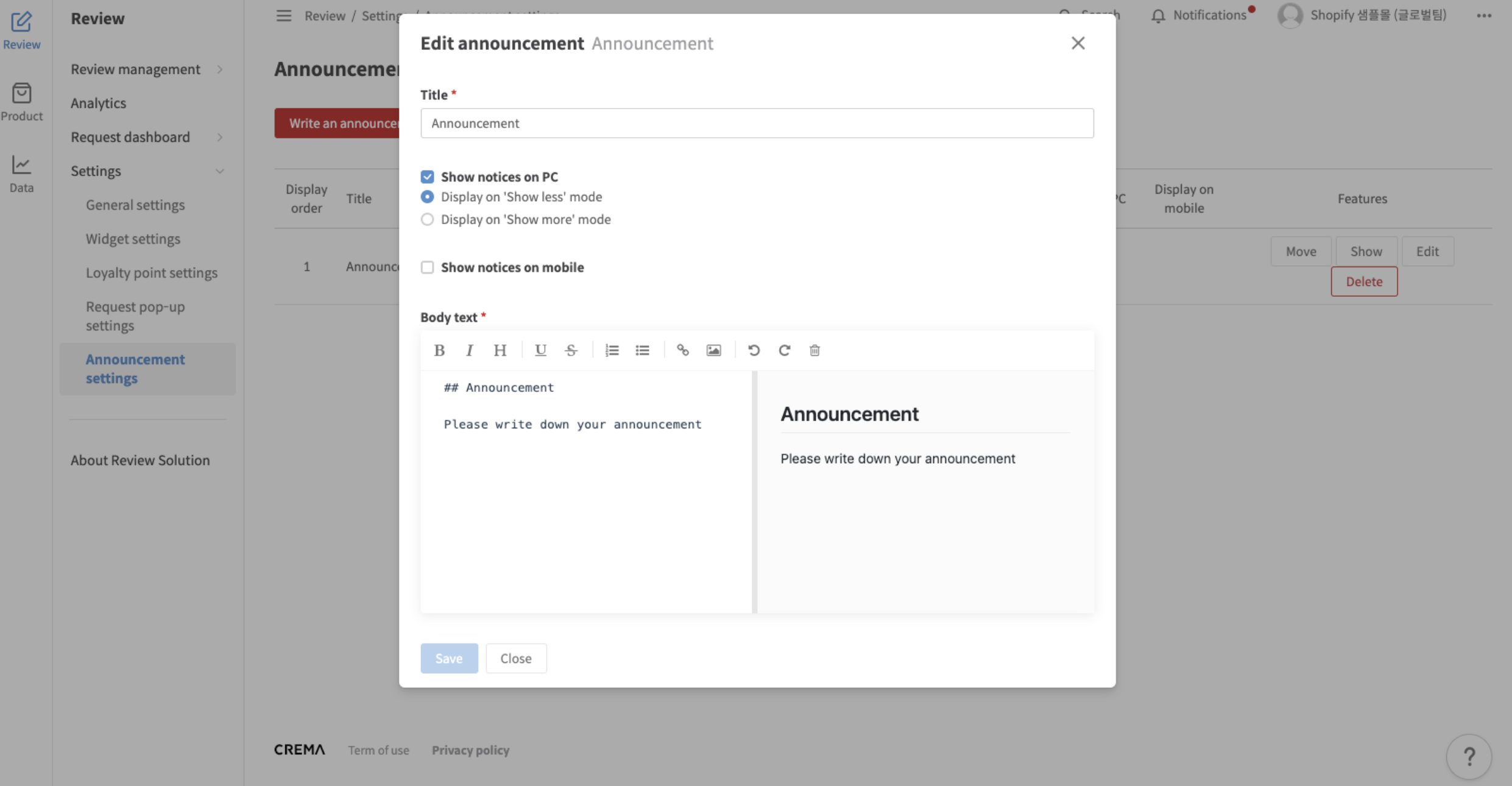 Use CREMA announcement feature to create, customize, and display messages on your store.