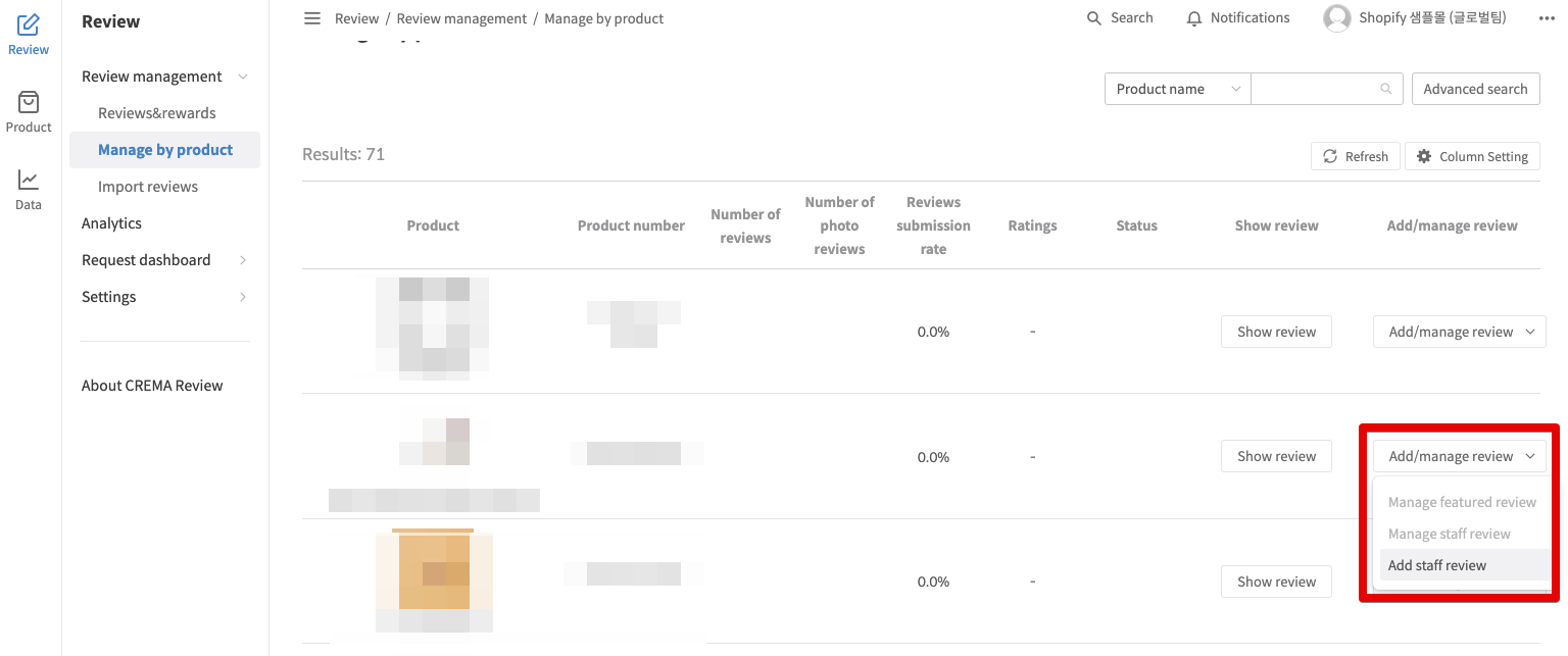 - Click Add/manage review → Add staff review button of the product you want to write reviews.