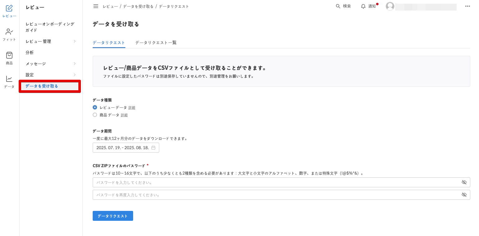 [レビュー] → [データを受け取る] → [データリクエスト]タブに移動します。
