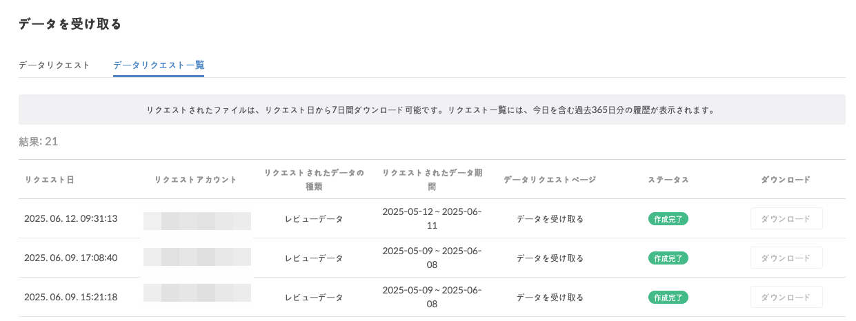 [データリクエスト一覧]タブで、過去にリクエストしたデータエクスポートの履歴を確認できます。