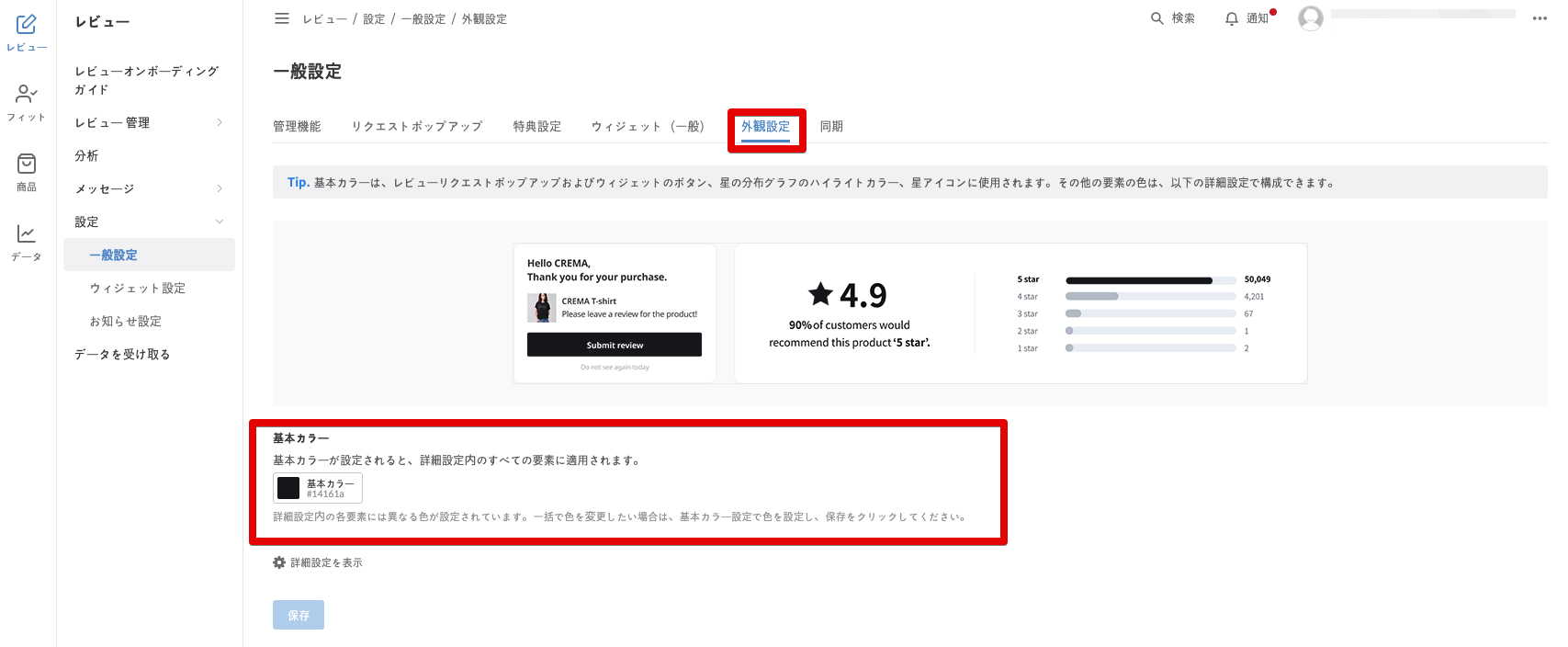詳細設定では、以下の要素の色を個別に変更することもできます:星の分布グラフの色, 「もっと見る / 少なく表示する」ボタンの色、星評価アイコンの色、レビューリクエストポップアップ内のボタンの色。