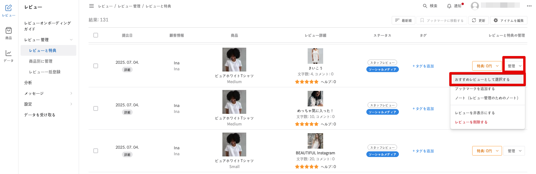 おすすめとして表示したいレビューの 「管理 → おすすめレビューとして選択する」 ボタンをクリックします。