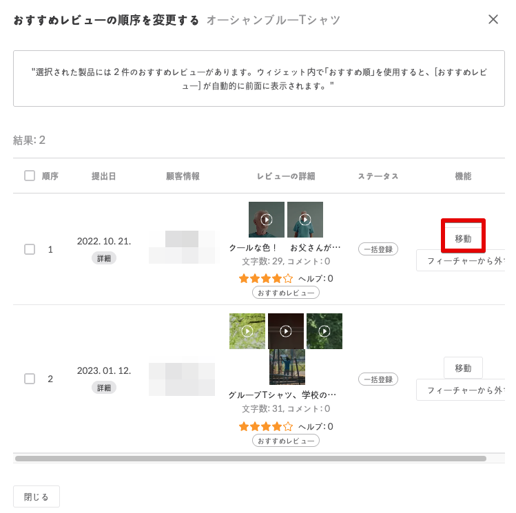 また、順序を変更したいおすすめレビューにチェックを入れ、「移動」ボタンをクリックして順番を調整することも可能です。