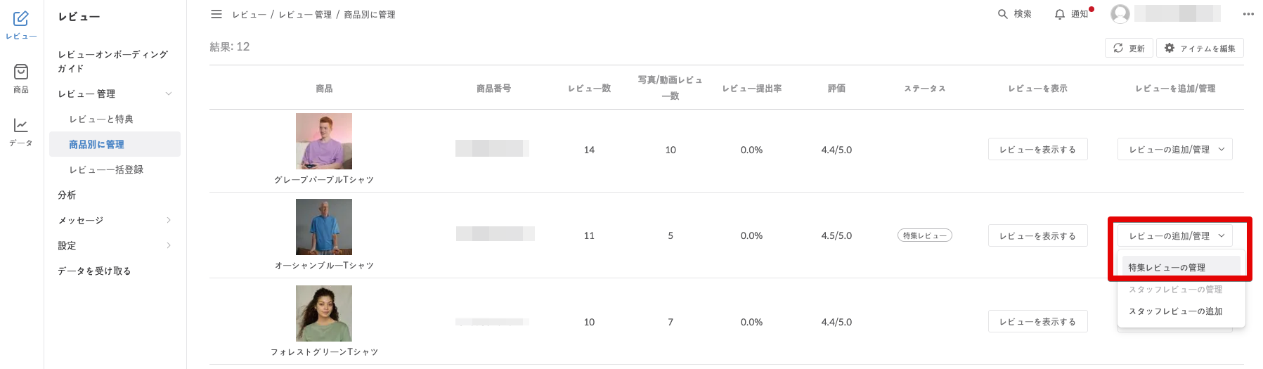 レビュー管理 → 商品別に管理 に進みます。
