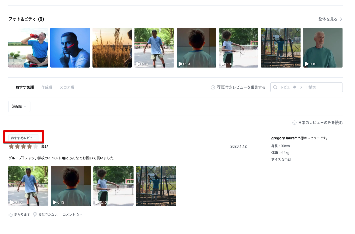 お気に入りのレビューを「おすすめレビュー」に設定することで、商品ページのレビューウィジェット上部に常に表示させることができます。