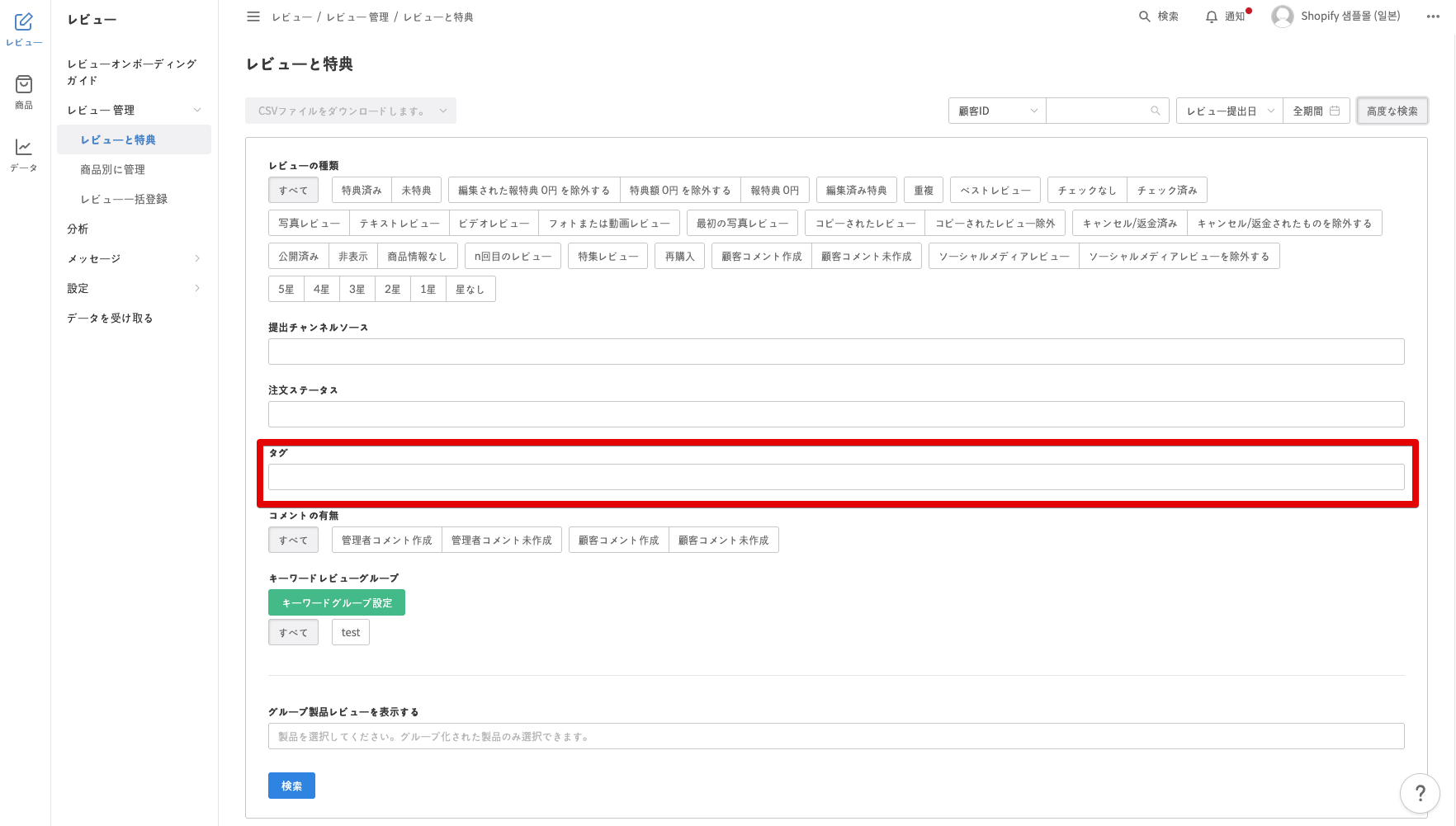 レビュー管理をより効率的に行うために、レビューに付けられたタグで絞り込みを行うことができます。