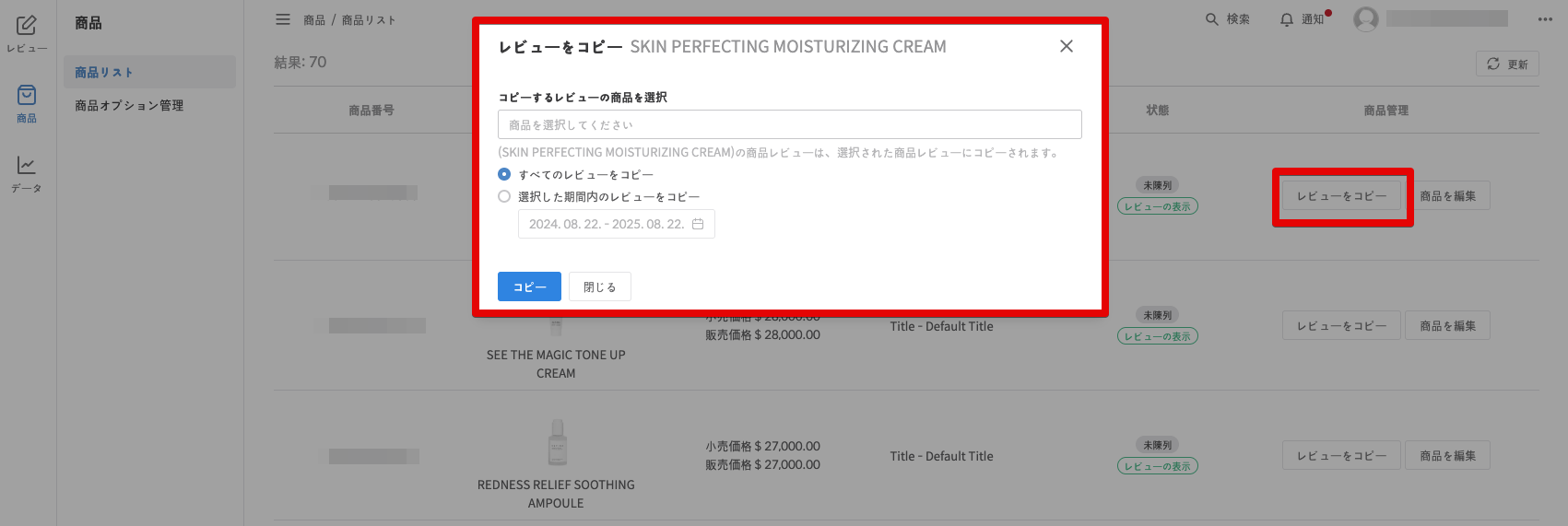 コピー元となる商品の [レビューをコピー] をクリックします。