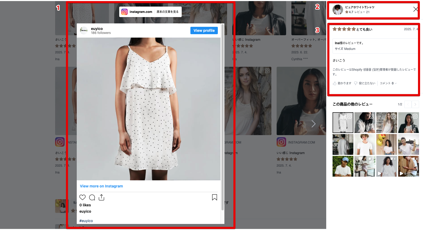 ソーシャルメディアレビュー機能を使って、InstagramやYouTubeのユーザー生成コンテンツ(UGC)を、各種ウィジェットに表示できます。