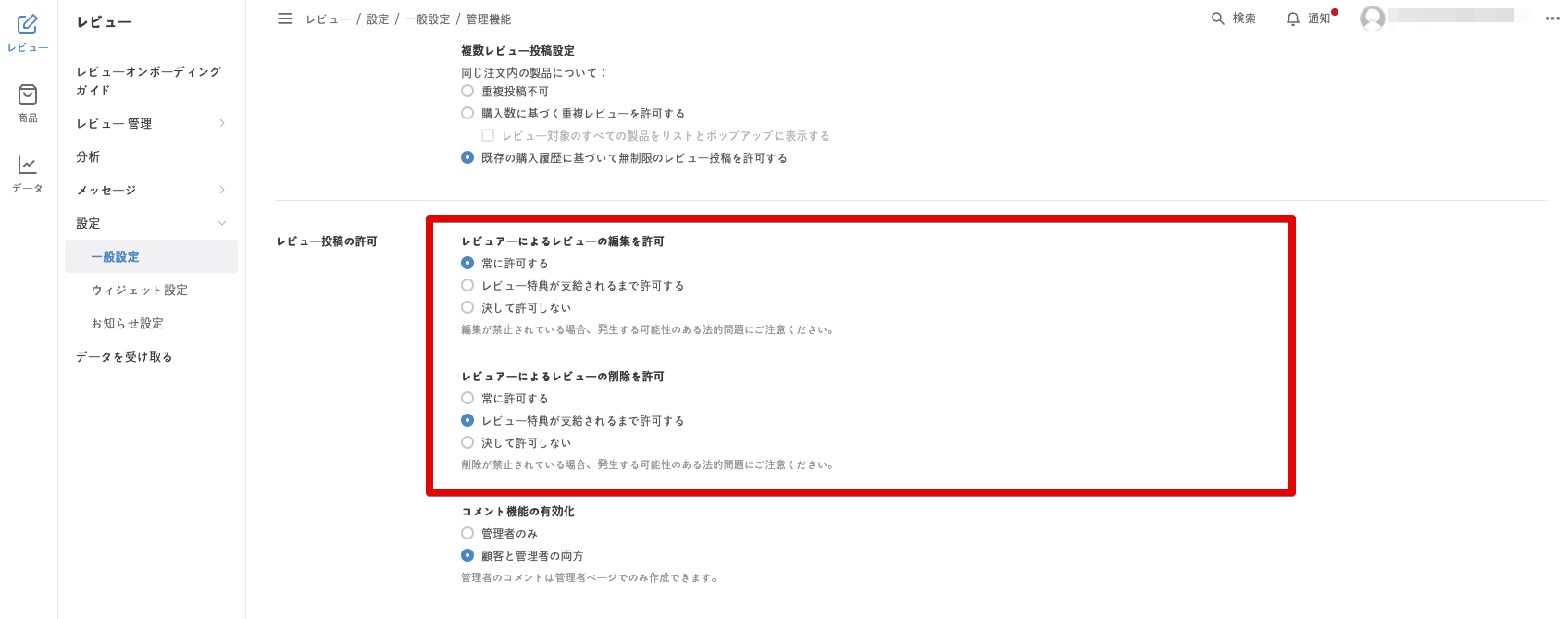 レビュー投稿後に編集や削除を行えるかどうか、レビュアーの権限を設定できます。