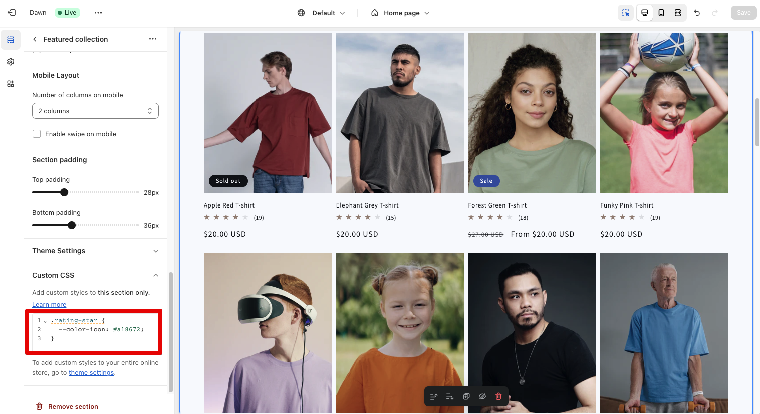 - 星評価を設置したいセクションをクリックします。通常は「Featured collection」「Featured product」「Product Grid」などと呼ばれます。