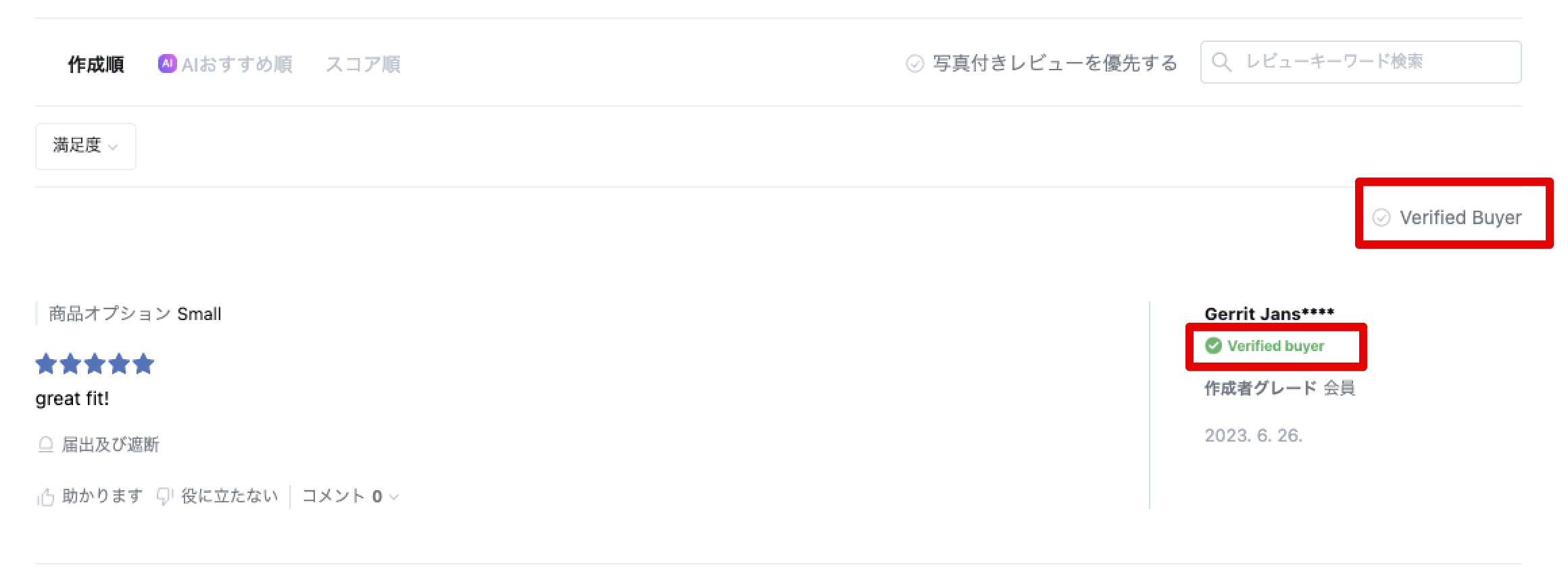 Verified Buyer(認証購入者)バッジは、レビューが実際に商品を購入したユーザーによるものであることを示し、レビューの透明性と信頼性を高めることで、顧客との信頼構築に貢献します。